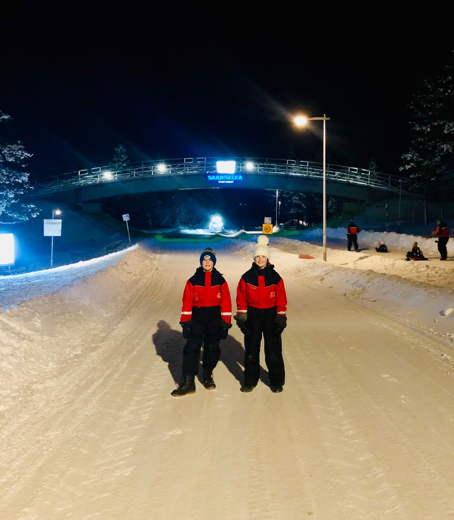 Our first afternoon in Saariselkä was about getting our bearings and making the most of the snow. With only a few hours of daylight in winter, it was already dark when we borrowed sledges from the hotel and walked to the big hill on the edge of town. It was all lit up for sledging and the atmosphere was brilliant lots of laughter, fast runs down the slope and rosy cheeks all round. Back at the hotel, we tucked into a hearty evening meal and squeezed in a bit more snowy fun before bed. It had been a very early start with a 6am flight and with the travel time from Newcastle to the Arctic Circle an early night was definitely needed.