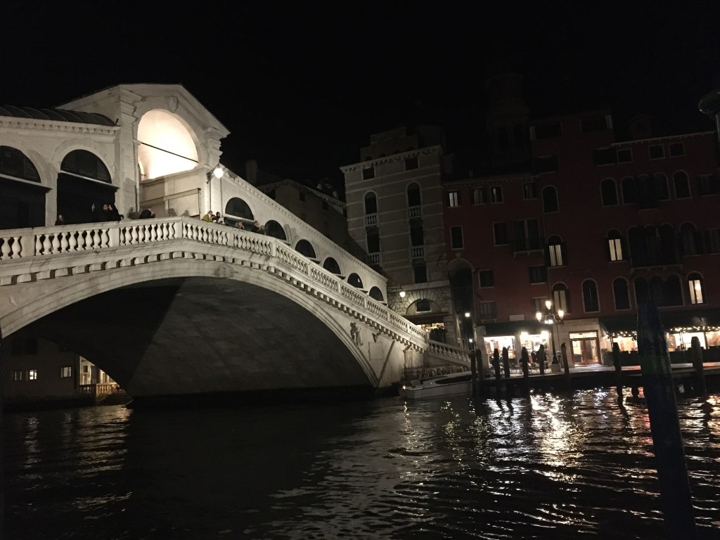 The Rialto Bridge shimmering over the Grand Canal at night